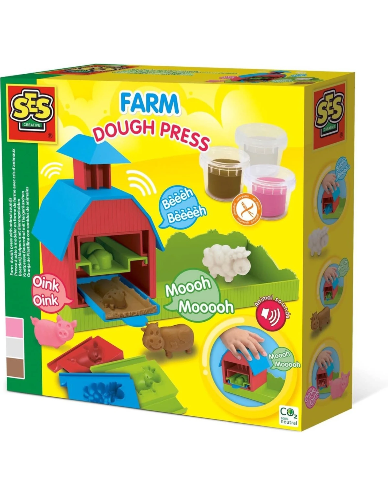 Dit is een heel bijzondere boerderij! Kies een dierenvormpje, plaats hem in de boerderij en doe er klei bij… Zodra je op het dak van de boerderij drukt, hoor je het geluid van het door jou gekozen dier en is je kleidiertje klaar. Breng hem snel naar de wei waar hij met zijn kleivriendjes kan spelen. Probeer ze allemaal! Knor knor, Beeee Beeee, Boeeehh! Excl. twee AAA batterijen.