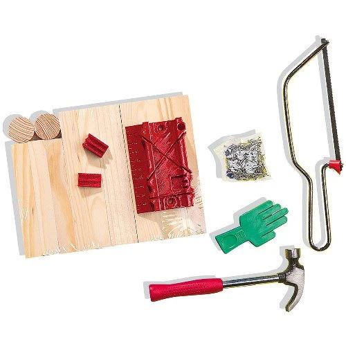 Inhoud set: hout, spijkers, zaag, verstekzaagbak, lijm en hamer.