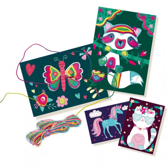 Deze dieren zien er prachtig uit met de neonkleurige veters en zijn gemakkelijker te maken dan je zou denken! De achtergrondkaarten hebben zelfklevende vlakken en maken het gemakkelijk om de gebieden één voor één met de draden te vullen. Probeer verschillende opties en pas aan waar je wilt, met deze plakkaarten is corrigeren mogelijk.