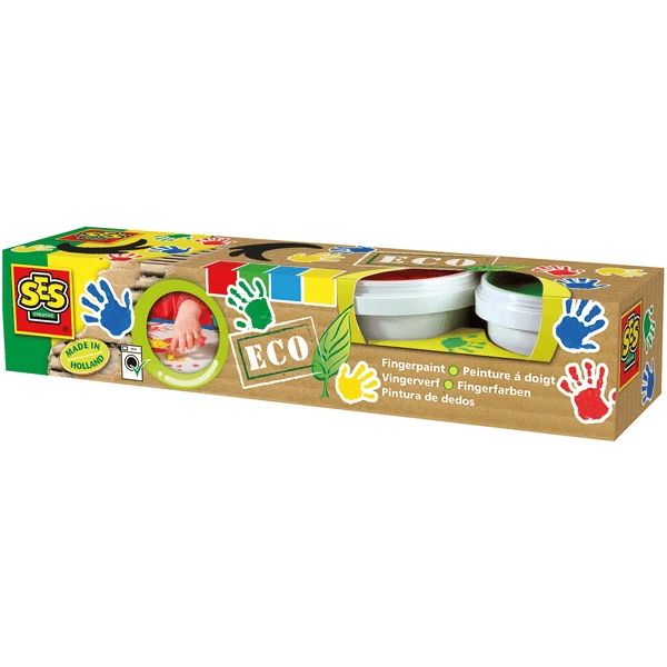 Inhoud: 4 basiskleuren eco vingerverf: rood, groen, blauw en geelMateriaal: KunststofAfmetingen: (Lengte x breedte x hoogte) 27,8 x 7 x 5,7 cmLeeftijd: Vanaf 2 jaar