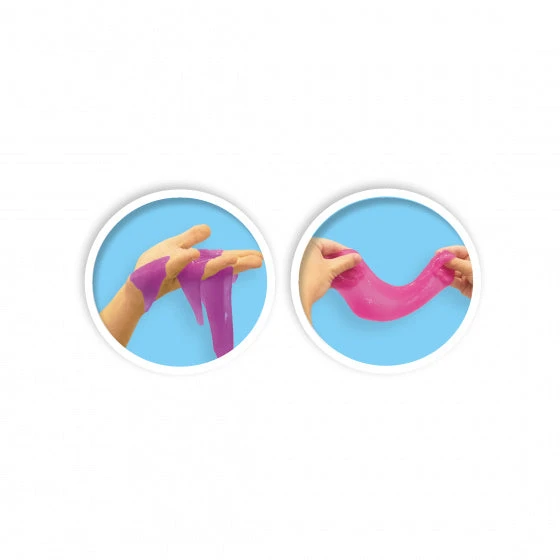 Slijm en glitter: dé ultieme combinatie! In deze set zitten twee potjes met kant en klaar slijm. Maar het zijn wel twee verschillende soorten slijm! In het ene potje zit dik, rekbaar, roze parelmoer slijm om in te kneden. In het andere potje zit glibberig paars glitterslijm. Lekker kliederen dus!