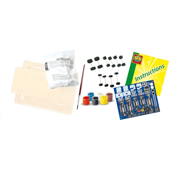 - Inhoud: schimmel, gips, wielen, 6 verven, penseel, sticker, maatbeker, gebruiksaanwijzing