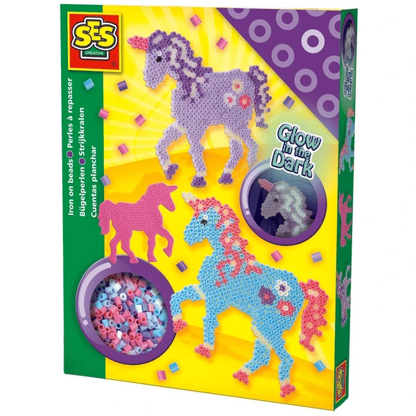Inhoud: 1.200 strijkkralen (inclusief “Glow in the Dark” strijkkralen), legbord “unicorn”, strijkpapierMateriaal: kunststofAfmetingen: ca. 15 x 4 x 20 cm Leeftijd: Vanaf 5 jaar